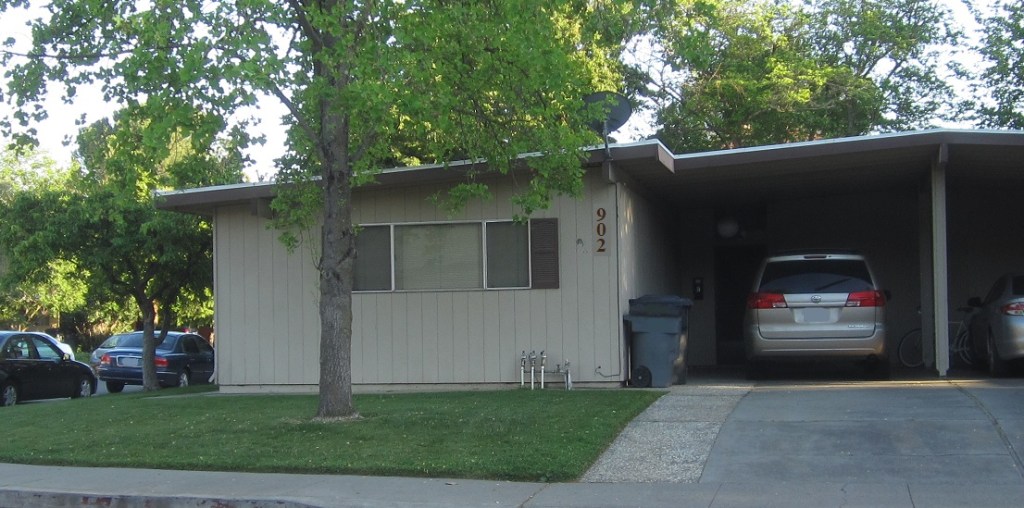 At the end of the long block, the street made a 90-degree right turn. Our new house, 902 Acacia Drive, was right on the corner, the left side of the last duplex in this row. The living area made an L-shape, with three bedrooms on the left, a covered parking spot on the right, and a living room, dining room, and kitchen in the back. The attached house on the right, 904 Acacia Drive, appeared to have the same floor plan, but mirrored, so that the two covered parking spots were adjacent. Like our apartment last year, this house had three bedrooms, and I would be sharing the large bedroom. This one had two full bathrooms, though, with one of the bathrooms attached to my bedroom. The old apartment had one full bathroom off of the upstairs hallway and a toilet and sink, with no tub or shower, downstairs. I found it an interesting coincidence that, last year, I was sharing the large bedroom with a guy named “Shawn,” and this year I would be sharing the large bedroom with a guy named “Sean.”