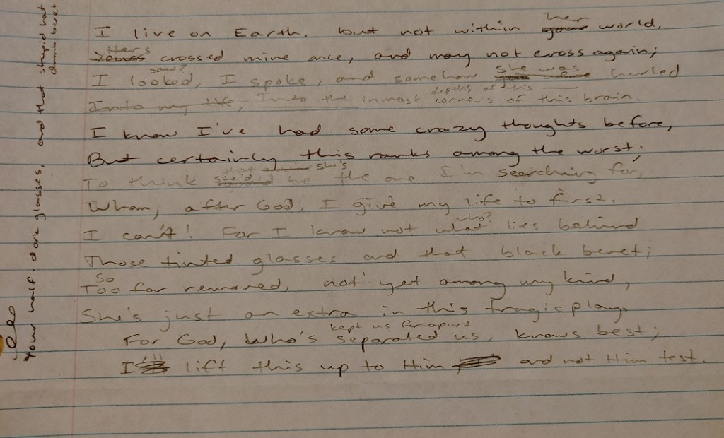 For an hour and a half, for most of Bible study, I thought that maybe I had gotten away with it. Everything felt normal. The only time I talked about things other than the passage of Scripture that we studied was when I got there and Colin asked me how student teaching was going. But I was wrong. After the study, I was usually in the habit of not rushing home, catching up with my friends first for a while. Courtney came up to me a few minutes after we finished, and asked, “How are you doing? I heard about what happened Sunday.”