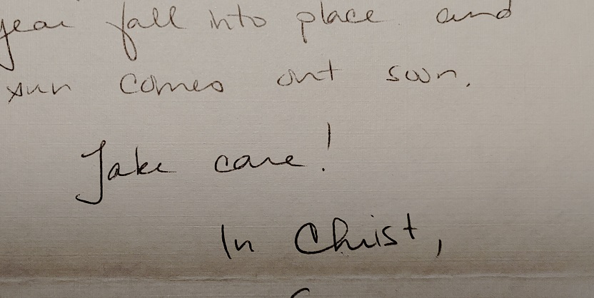 I heard a song on the radio today that I kind of like. The chorus said, “Tell me all your thoughts on God.” Do you know that song? Is that one of your Christian bands? How is your class going? One more week, right? Talk to you later. Love, Mom